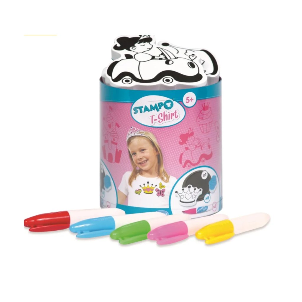 Aladine Stampo T-Shirt - Razítka na textil, 8 ks - Pohádkové království je kreativní sada navržená pro děti od 5 let, která umožňuje vytvářet originální textilní designy s pohádkovými motivy. Sada obsahuje 8 gumových razítek s pohádkovými motivy, 5 fixů na textil a 1 černý razítkovací polštářek. Tato sada podporuje rozvoj kreativity a jemné motoriky u dětí.