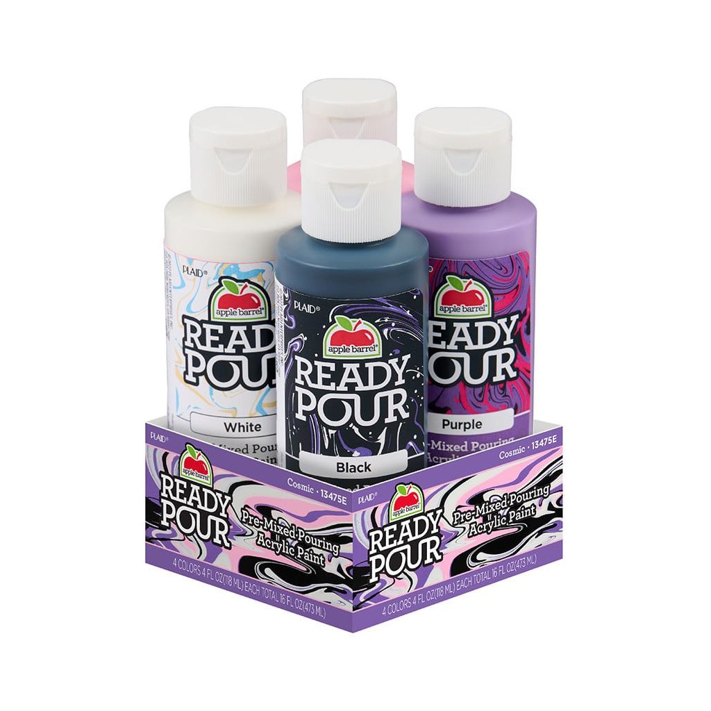 Apple Barrel Ready Pour™ Cosmic Set je ideální sada pro začátečníky, obsahující čtyři 118ml lahvičky předem namíchané akrylové barvy inspirované galaxií. Barvy se snadno používají, není nutné je míchat, a vytvářejí úžasné mramorové efekty s jemným saténovým povrchem.