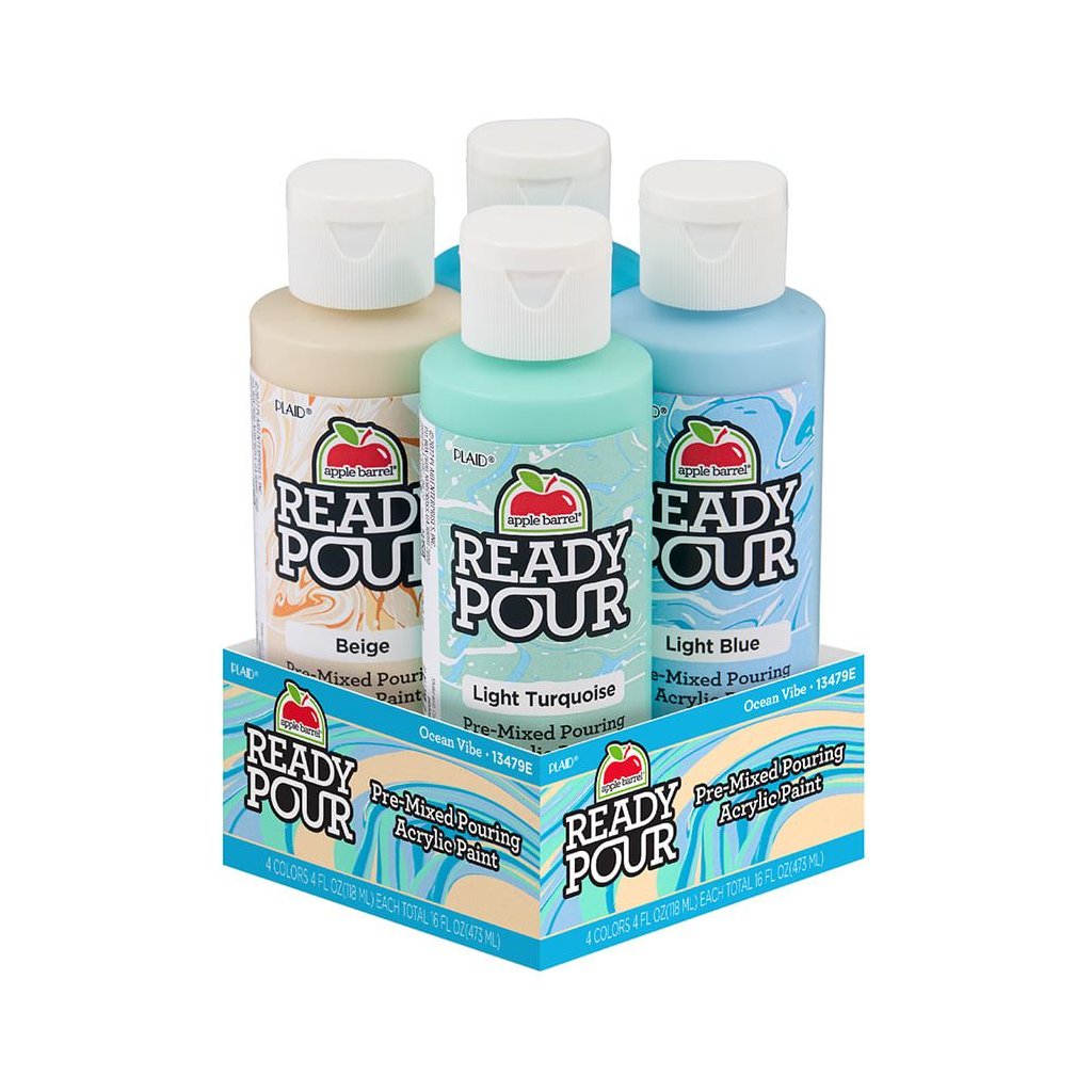Apple Barrel Ready Pour™ Ocean Vibe Set je ideální pro všechny, kteří chtějí vytvářet jedinečné umělecké díla inspirované oceánem. Tato sada obsahuje čtyři 118ml lahvičky s předem namíchanými barvami ve světlé tyrkysové, světle modré, modré vlny a béžové barvě, které jsou perfektně zvolené pro vytváření mramorových efektů evokujících pobřeží a moře.