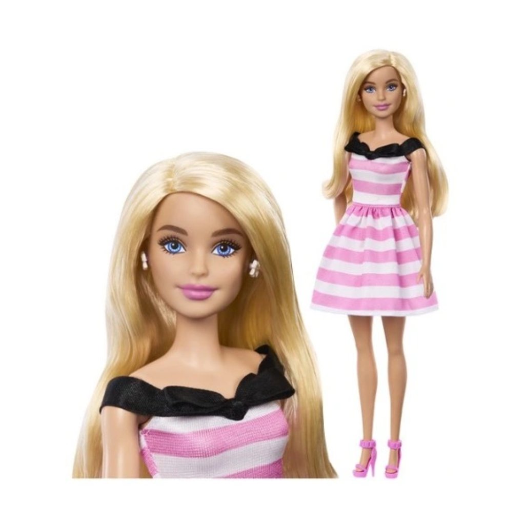 Módní panenka k 65. výročí Barbie s blond vlasy, růžovými pruhovanými šaty a doplňky.