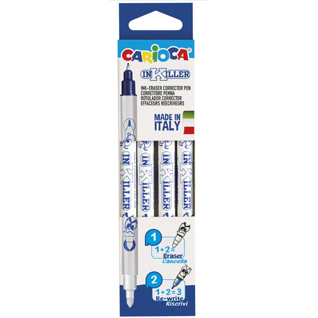 S Carioca InKiller zmizíkem už nebudou chyby žádný problém. Speciální náplň reaguje na inkoust, který jednoduše zmizí, a vy můžete okamžitě korektorem přepsat novým textem na stejném místě.