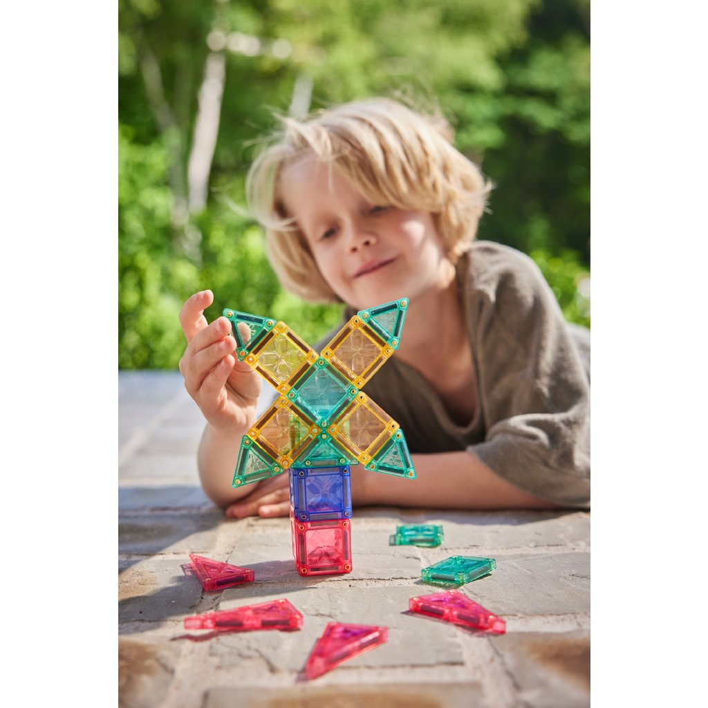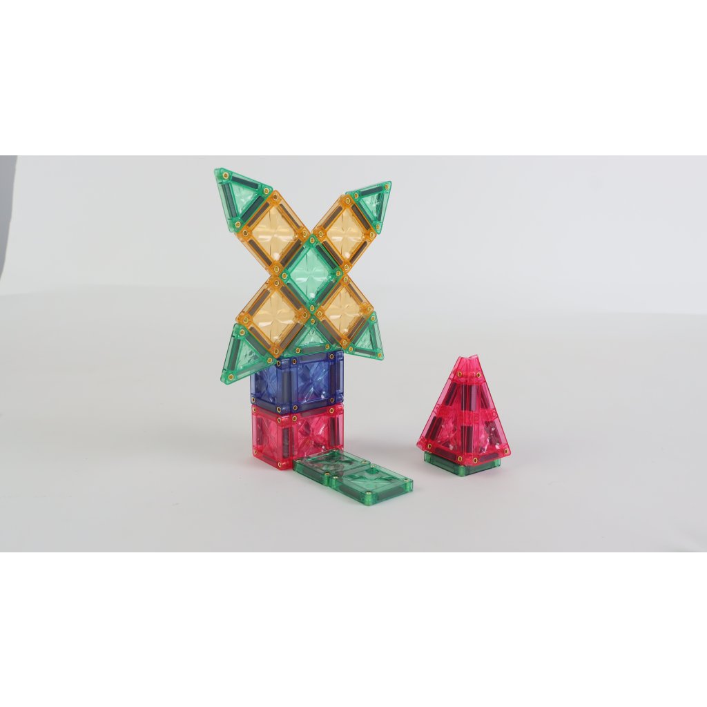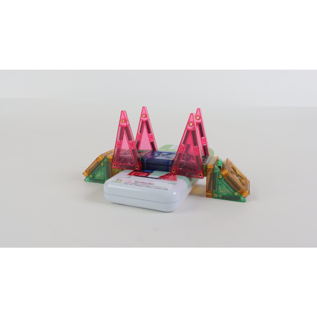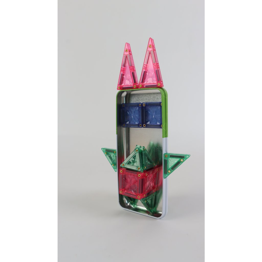 28 mini magnetických destiček je uloženo v kovové plechovce, která udrží všechny vaše mini stavby ve vzpřímené poloze a neporušené i na cestách.
