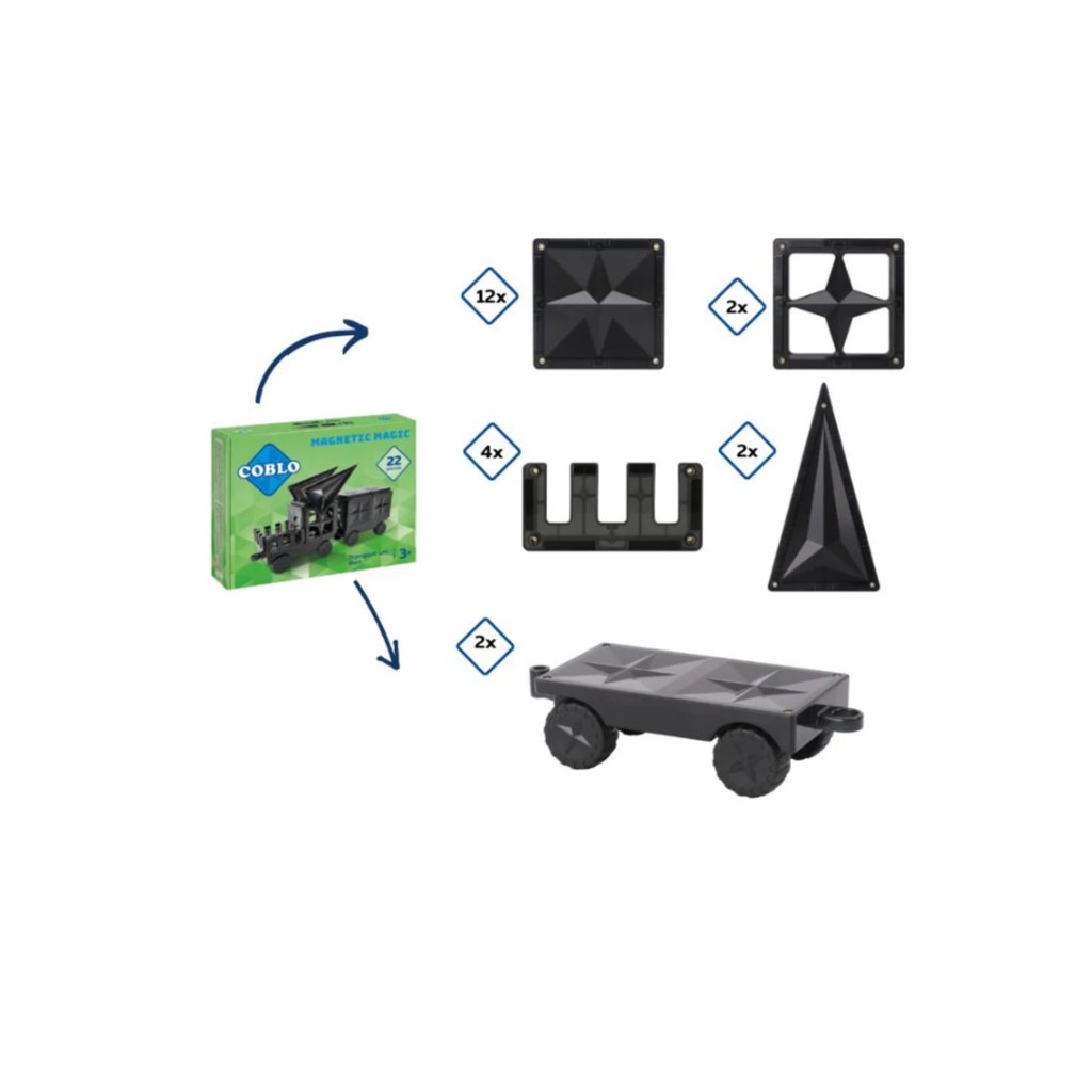 COBLO – Transport set černý 22 dílů je vhodný pro děti od 3 let a představuje skvělý způsob, jak obohatit stávající magnetické stavebnice o nové prvky.