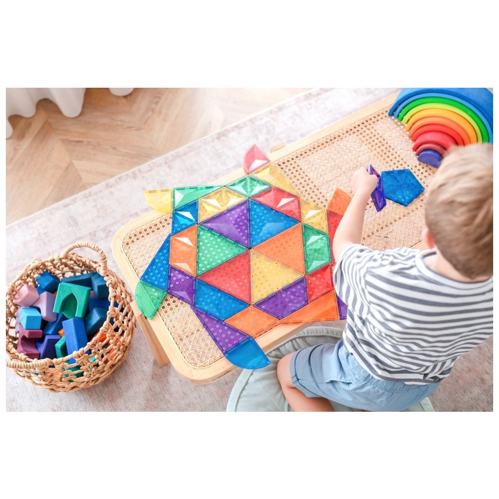- Světelné experimenty – průhledné dílky umožňují dětem zkoumat světelné efekty, když skrze ně prochází světlo, což přidává další rozměr zábavy a učení.