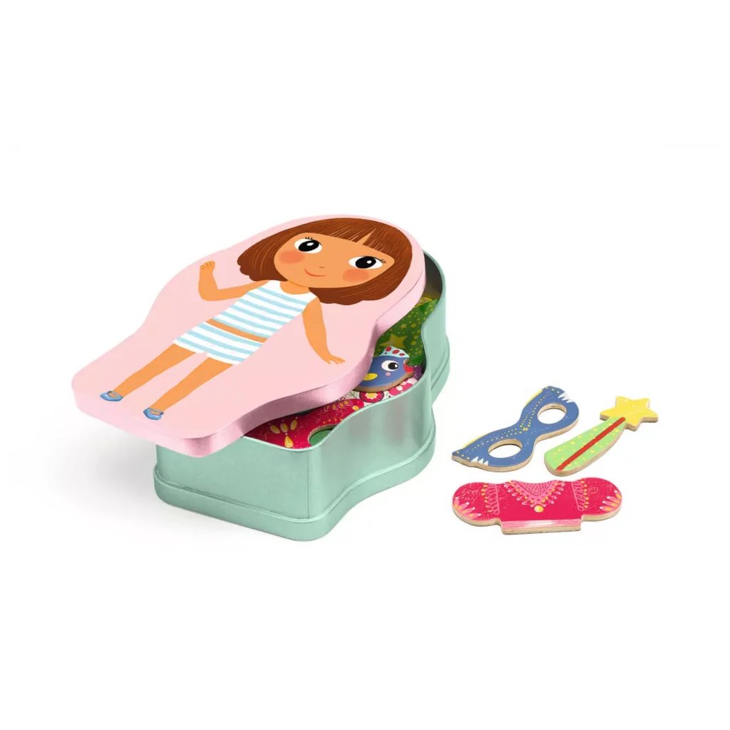 Skvělá zábava pro dívky od 3 let. Kovová krabička ve tvaru panenky s dřevěnými magnety obsahuje 24 kusů. Děti mohou přikládat magnety na obě strany krabice a vytvořit tak různé postavy princezny nebo víly. Velikost krabice je cca 16,5 x 21,5 x 5,8 cm.