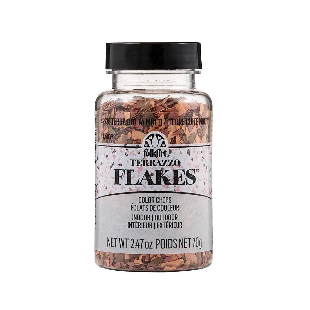 FolkArt Terrazzo Flakes umožňují snadno vytvořit realistický vzhled terrazza. Barevné matné vločky lze aplikovat na různé povrchy, jako je dřevo, kov, sklo, keramika nebo terakota, a dokonce je lze zapustit do pryskyřice nebo sádry pro větší hloubku.