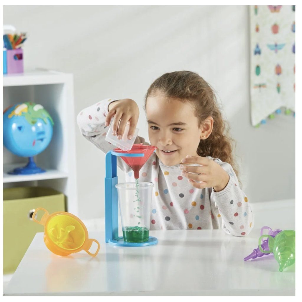 Hledáte hračku, která děti zabaví na hodiny a zároveň je něco naučí? Tato sada trychtýřů od Learning Resources je víc než jen obyčejné "přelévátko". Každý trychtýř má jiný tvar a dno, takže jimi voda protéká různou rychlostí. Děti mohou sledovat, jak se hladina mění, zkoušet filtrovat nečistoty přes sítko nebo pozorovat optické iluze, které vytváří tvar trychtýře. Je to dokonalý trénink trpělivosti, soustředění a jemné motoriky.