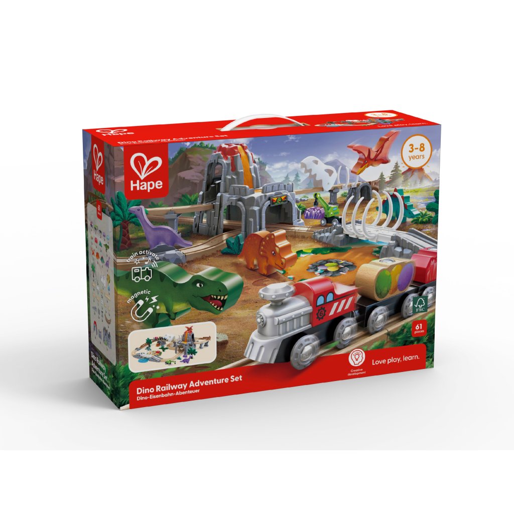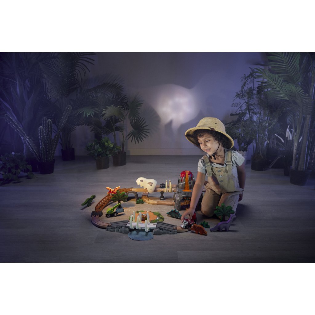 Dinosauří vláčkodráha Adventure Set – svítící verze od značky Hape posouvá klasickou hru s vláčkodráhou na novou úroveň díky světelným efektům, které zvýrazňují dinosauří svět a podporují hlubší ponoření do hry.