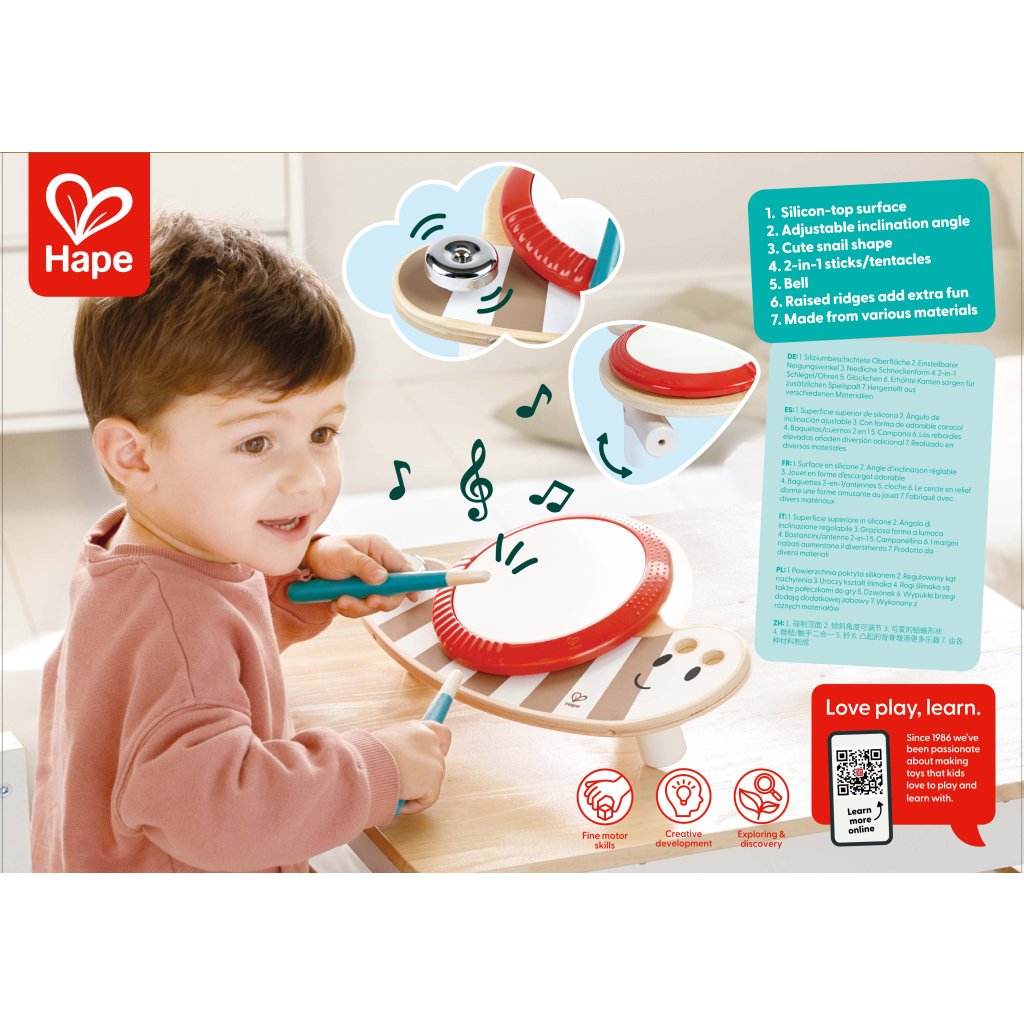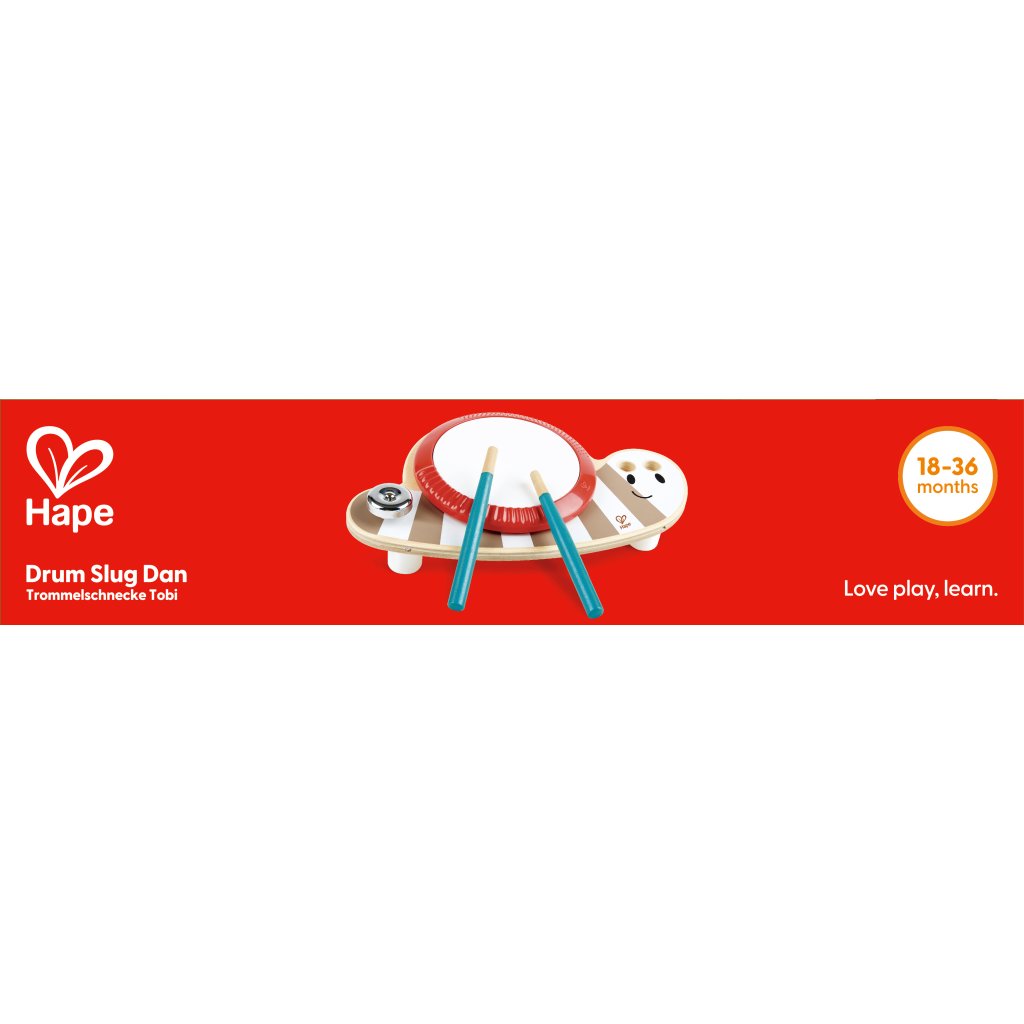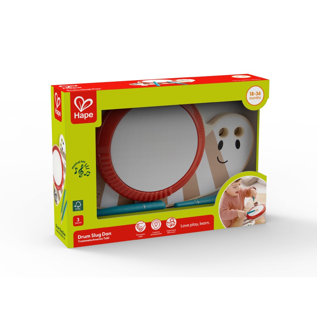 HAPE Slimák Dan je zábavný a originální buben, který v sobě spojuje hudební a motorický rozvoj. Děti mohou bubnovat do těla slimáka paličkou, což podporuje jejich koordinaci ruky a oka i smysl pro rytmus. Vzhled slimáka je navržen tak, aby si ho děti okamžitě zamilovaly – usměvavý výraz a pestré barvy přirozeně přitahují pozornost.
