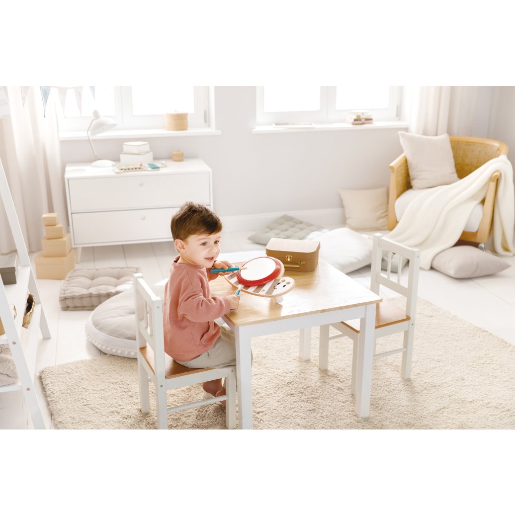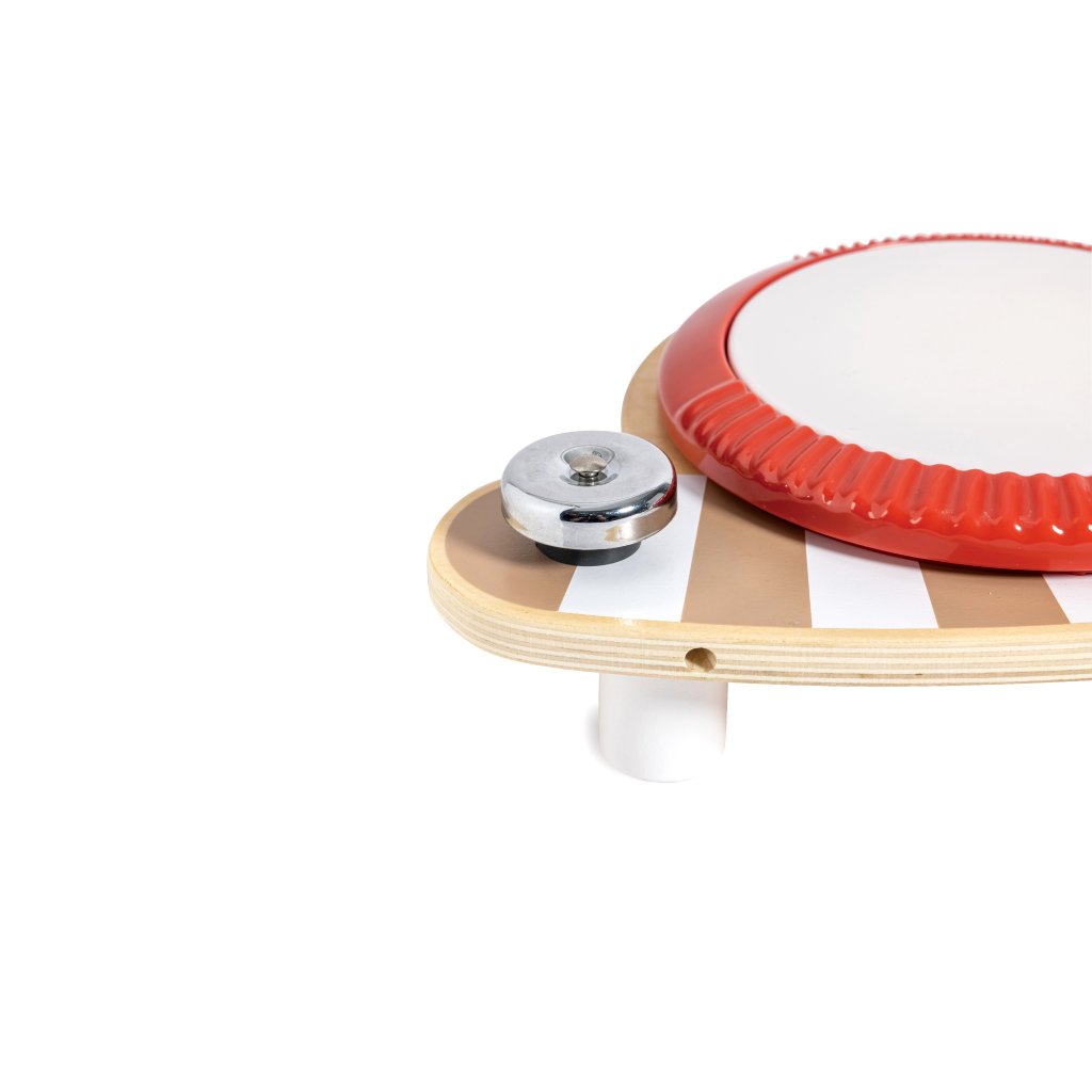 Buben je dostatečně robustní a bezpečný pro malé děti, vyrobený z odolného dřeva a barvený pouze ekologickými barvami bez škodlivých chemikálií. Kompaktní velikost a lehkost z něj dělají ideální hračku doma i na cesty.