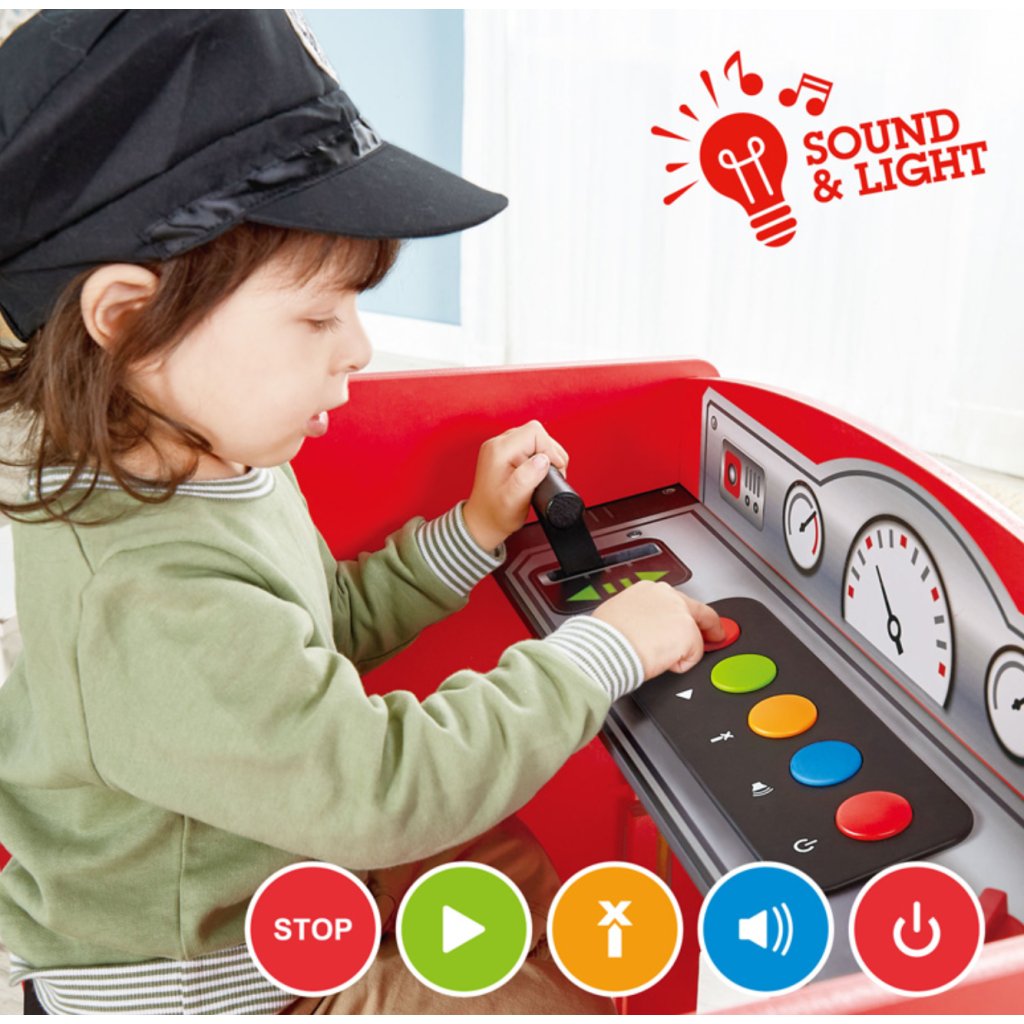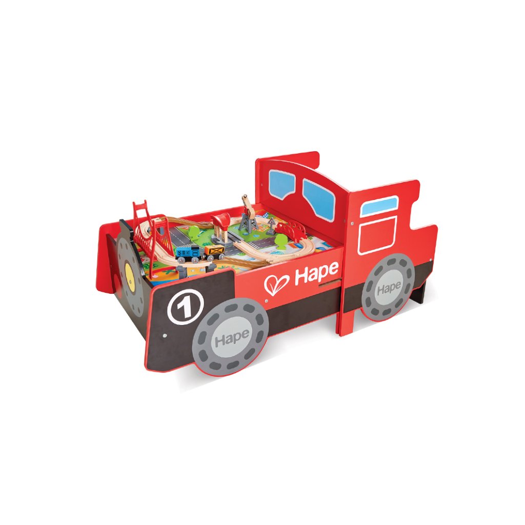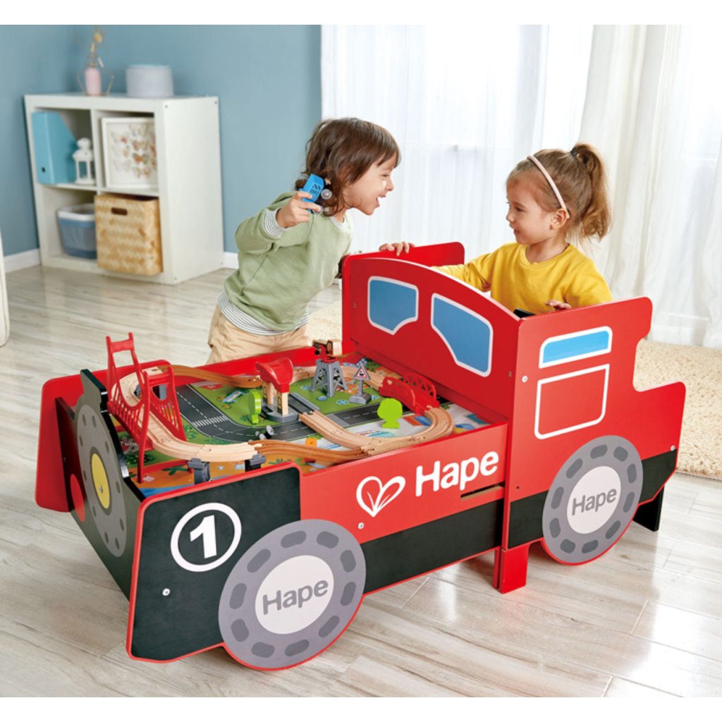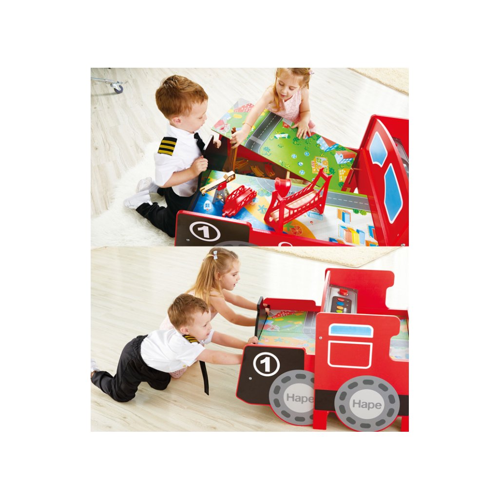 Hape Ride-On Engine Table je interaktivní dřevěná vláčkodráha s 32 díly, která kombinuje zábavu z jízdy s kreativním stavěním. Děti od 3 let se mohou stát strojvedoucími, ovládat světla a zvuky na palubní desce nebo posouvat vláček po rozkládacím stole. Po skončení hry lze všechny díly uložit do stolu, který se zasune do základny a šetří tak místo.
