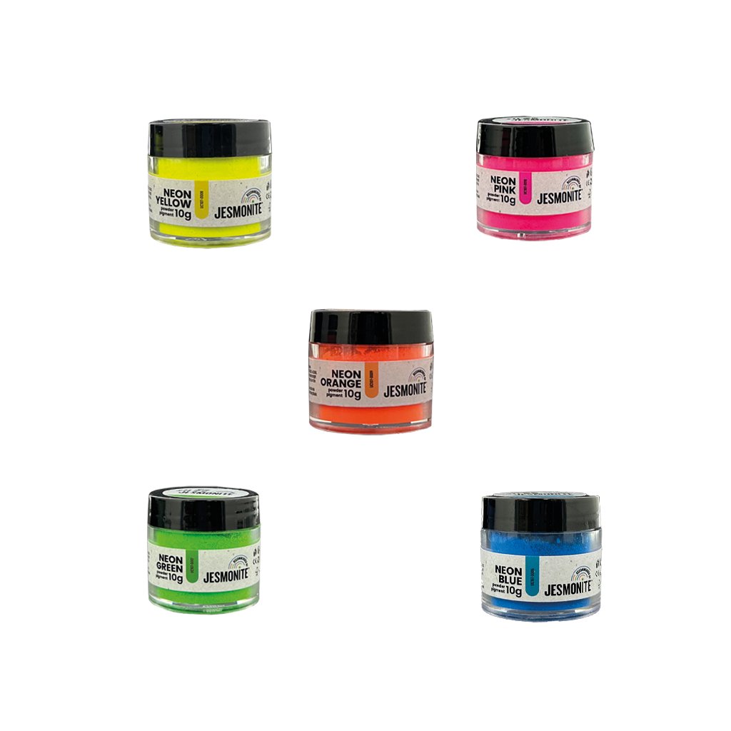 Sada značky Jesmonite obsahuje minerální práškový pigment v živých neonových barvách a je skvělým doplňkem pro vaše projekty s Jesmonite AC100 a AC300. Jasné a výrazné odstíny přinášejí do vašich děl neonový efekt, který podtrhne vaši kreativitu. I když nevyzařuje ve tmě ani není fosforeskující, přesto dokáže vašim výrobkům dodat unikátní a živý vzhled.