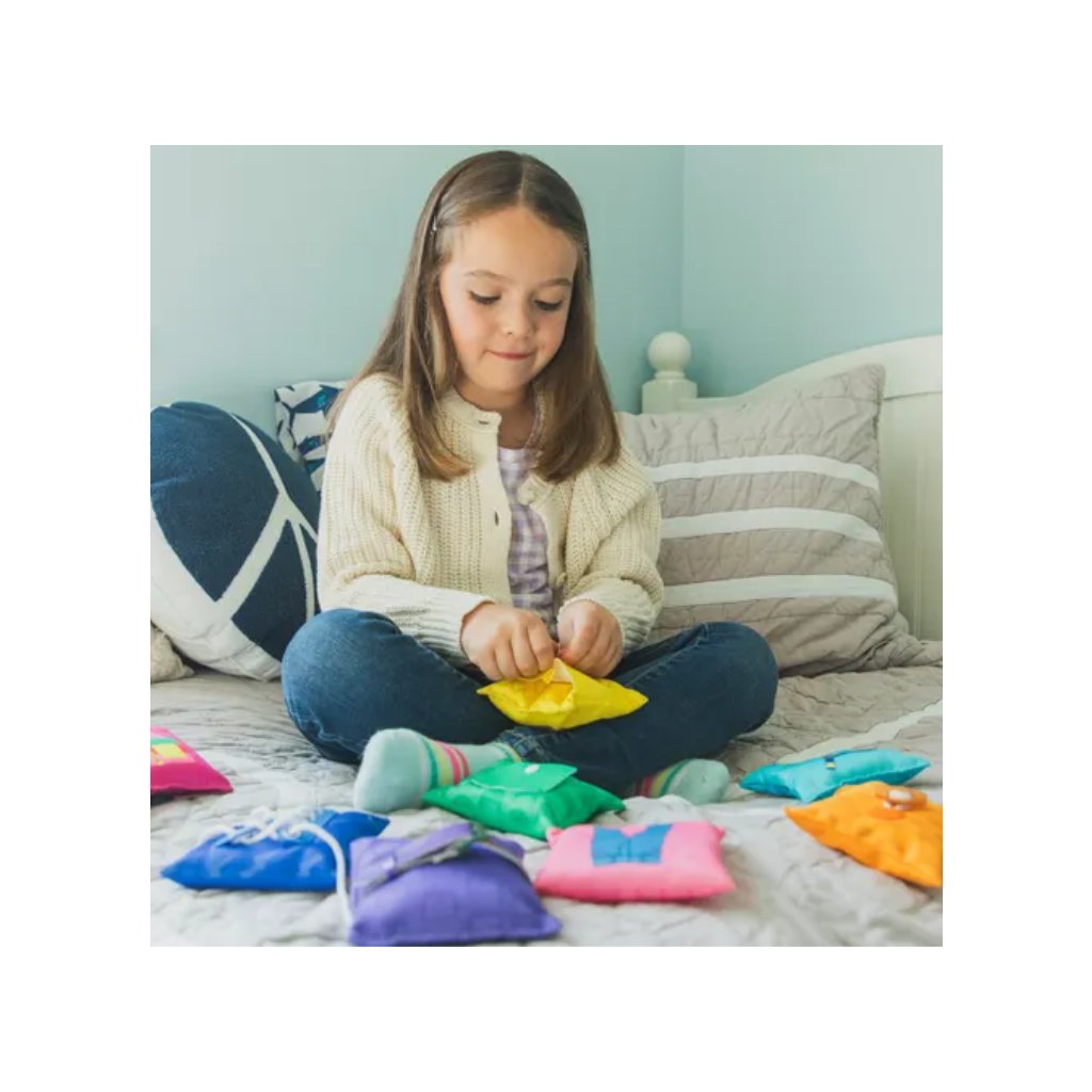 Sada obsahuje 8 barevných textilních pytlíčků, z nichž každý má jiný druh zapínání – knoflík, zip, patentky, suchý zip, pásek nebo šňůrky.