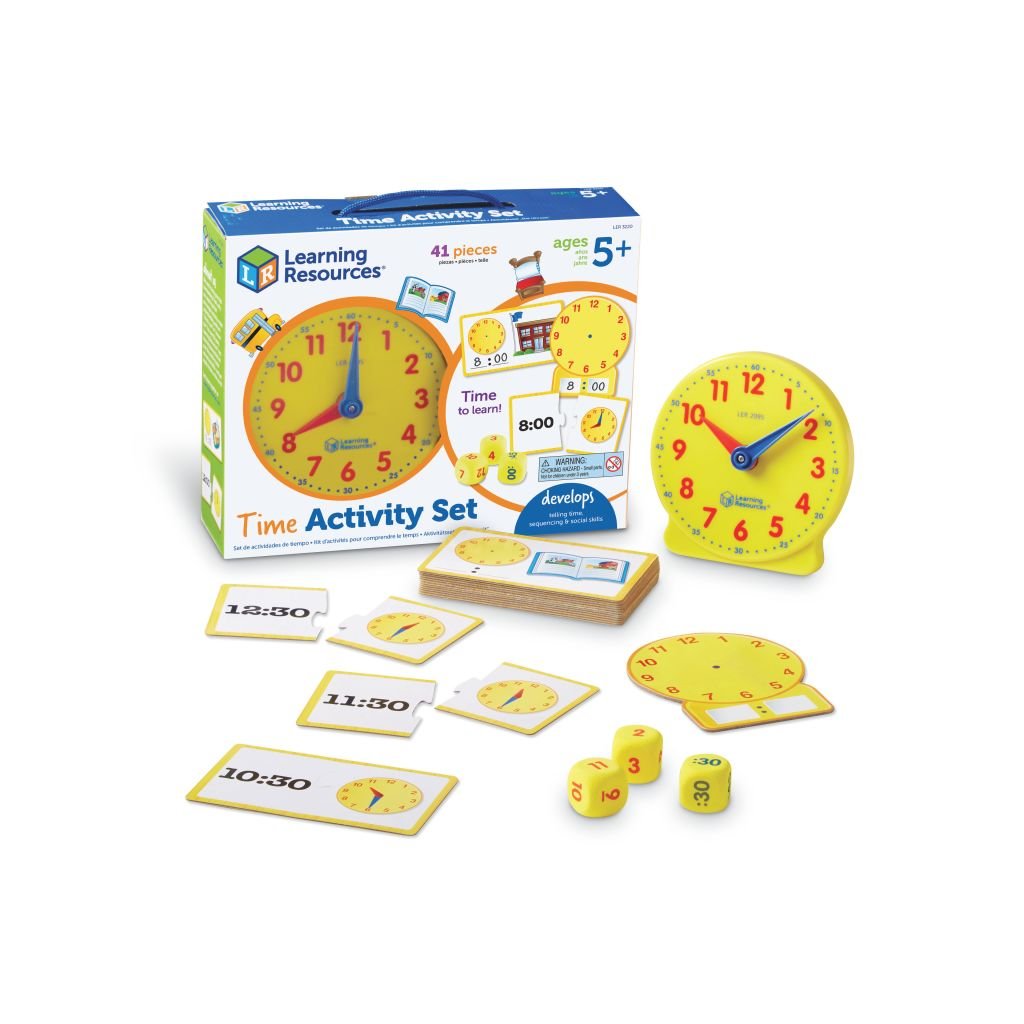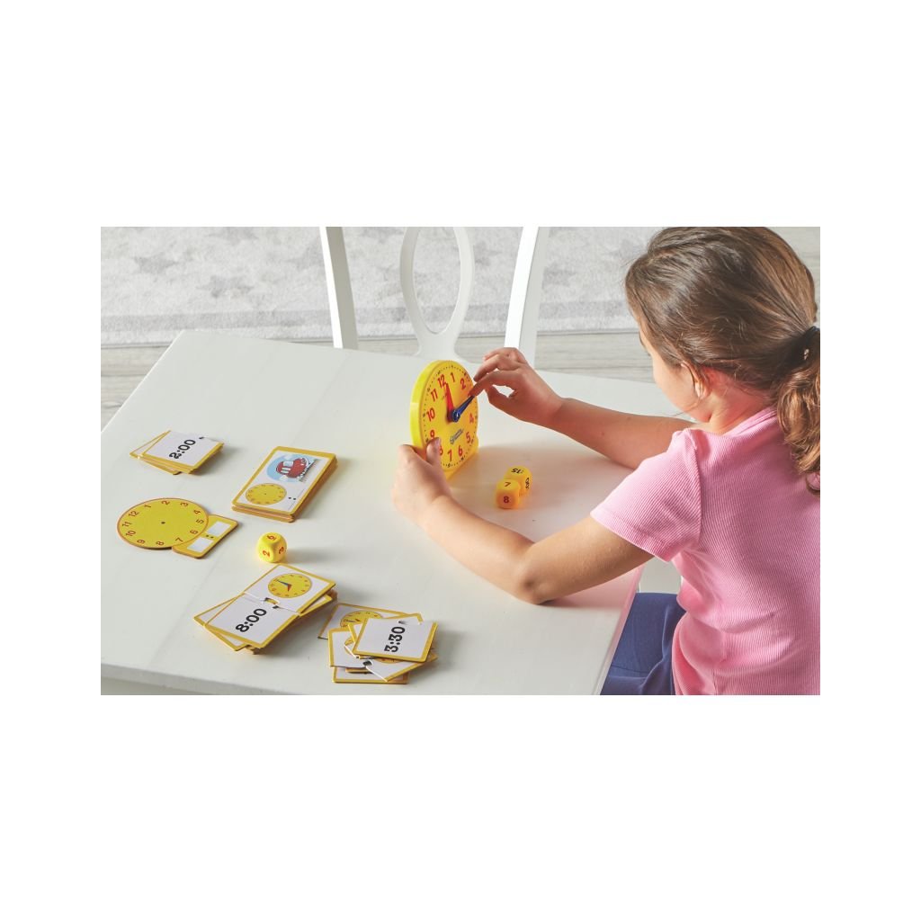 Tato výuková sada nabízí dětem možnost „vzít čas do ruky“ – pomocí velkých hodin s pohyblivými ručičkami, malých osobních hodin a množství kartiček, které ukazují typické denní činnosti od rána až po večer.