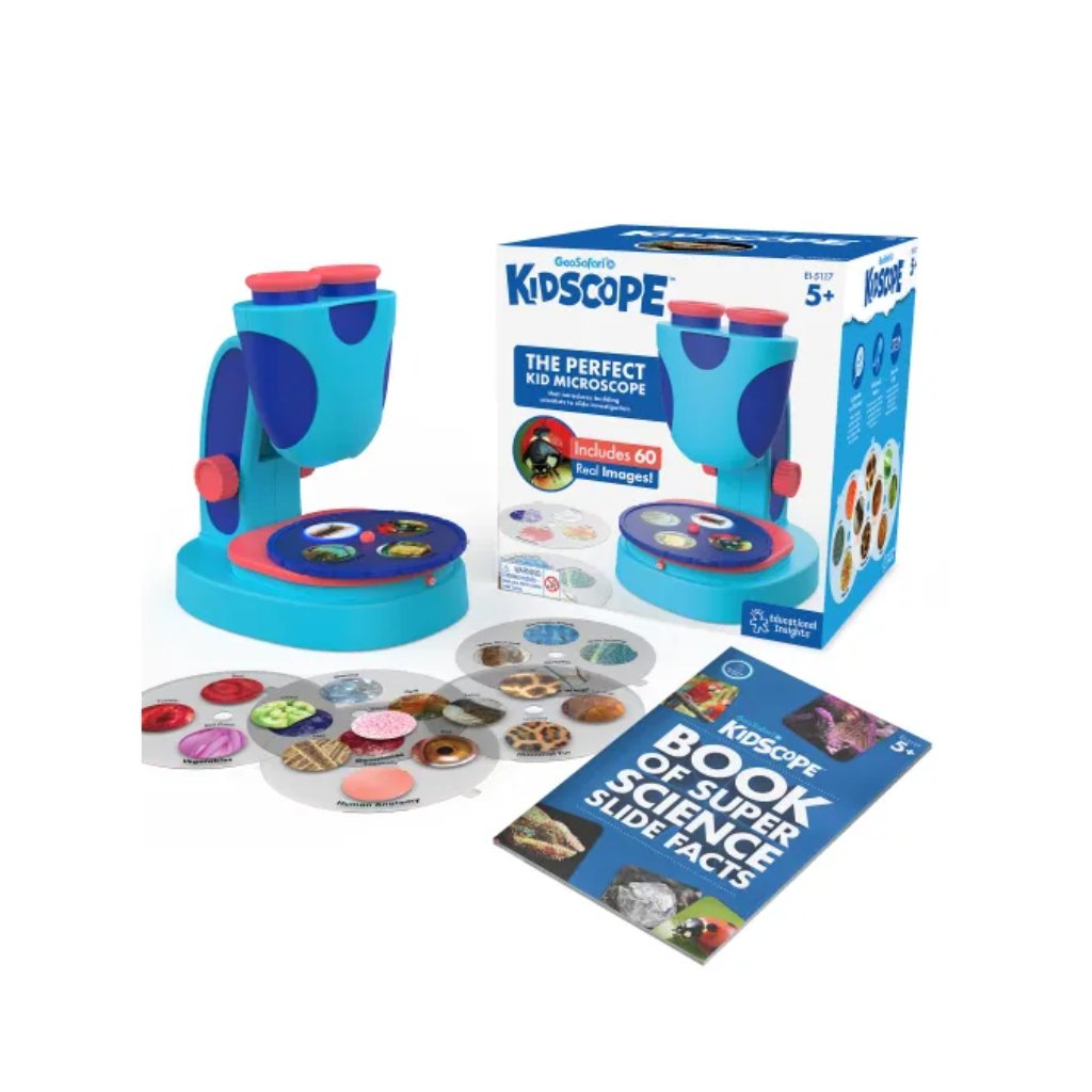 GeoSafari Jr. KidScope je dětský mikroskop, který hravou formou seznamuje malé vědce se světem vědeckého bádání. Obsahuje 15 diapozitivů se 60 vysoce kvalitními obrázky a možnost pozorovat i vlastní předměty.