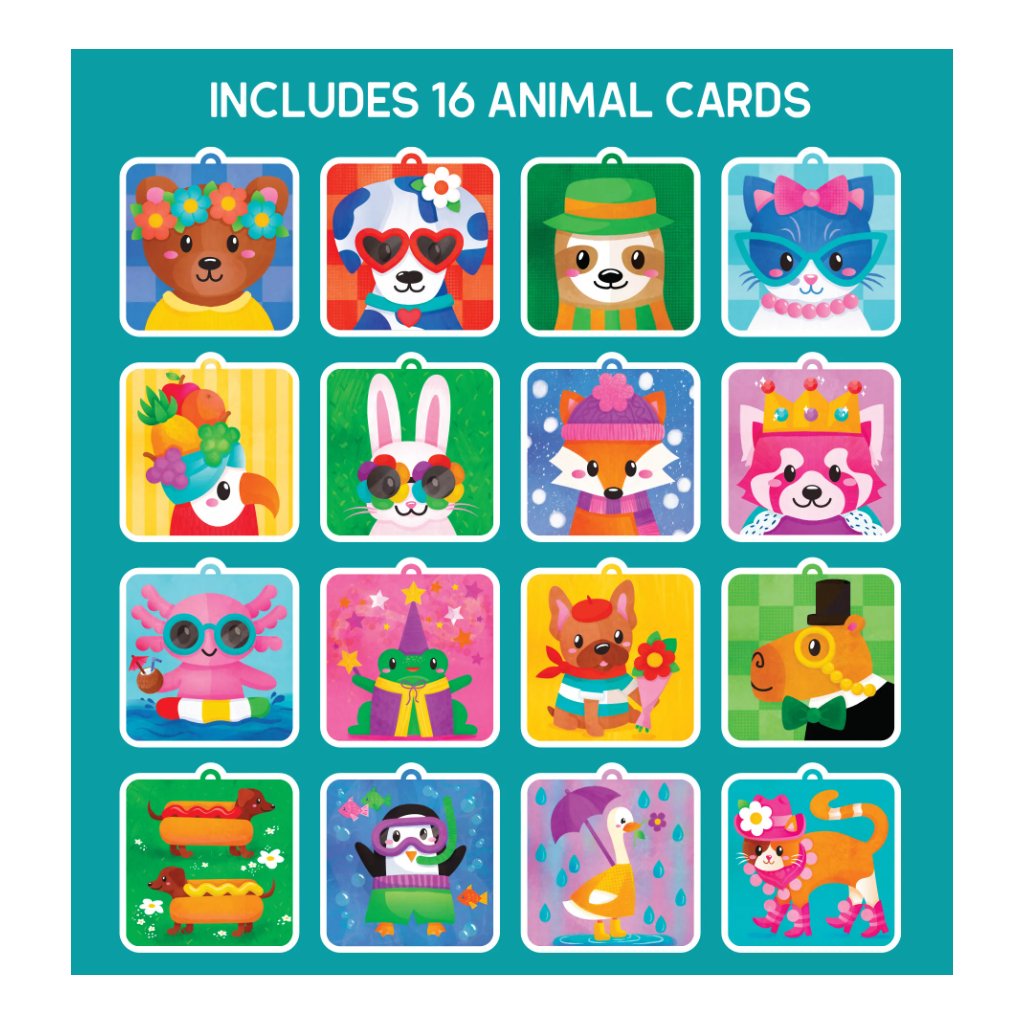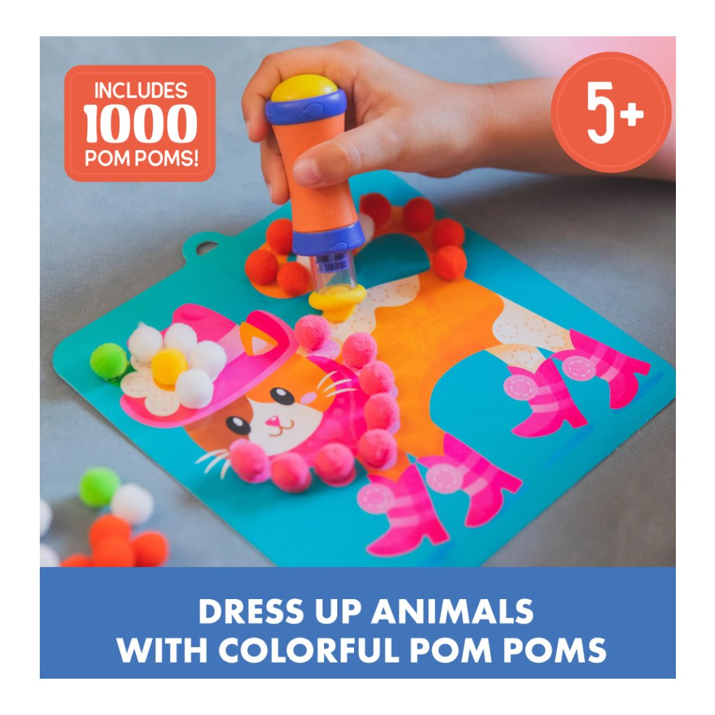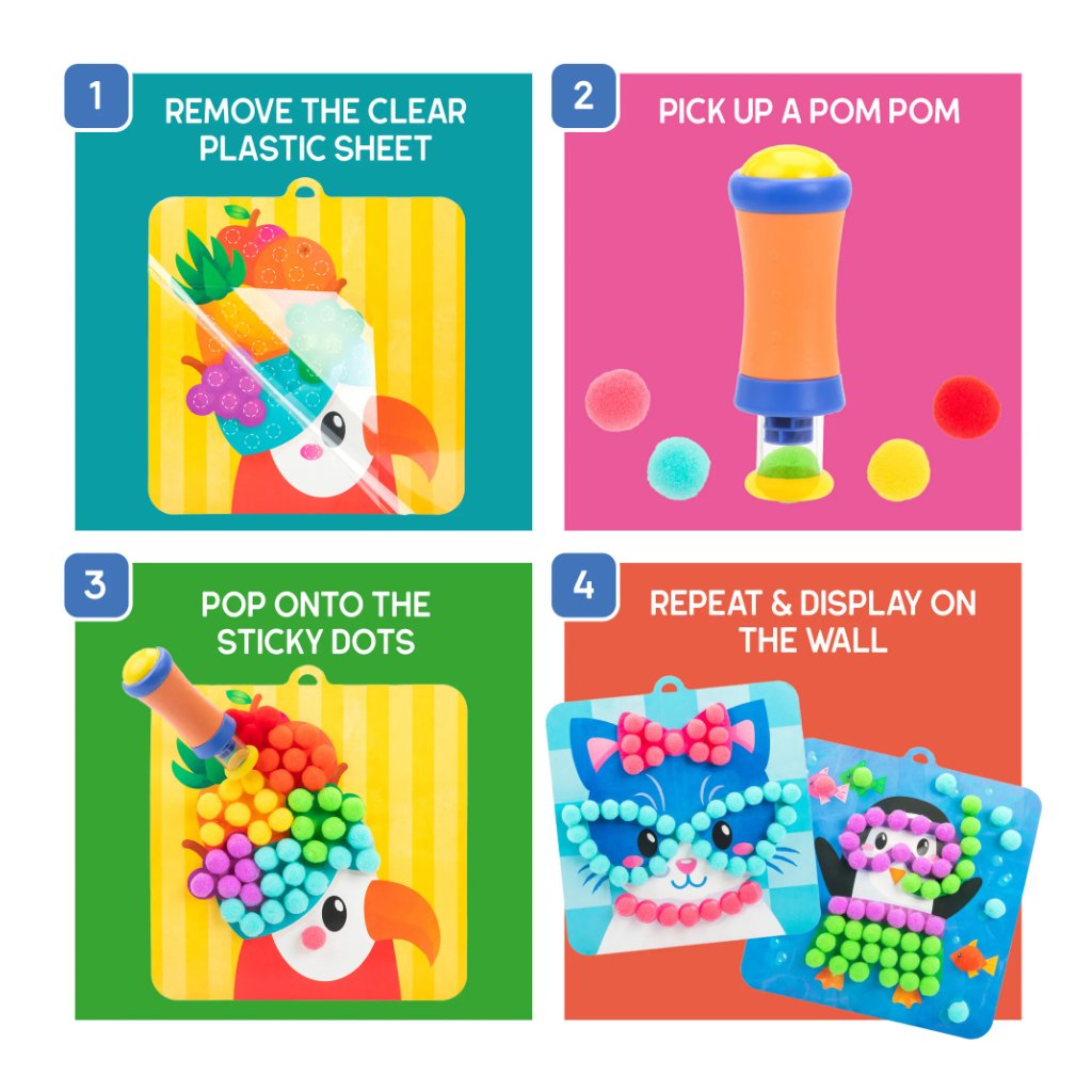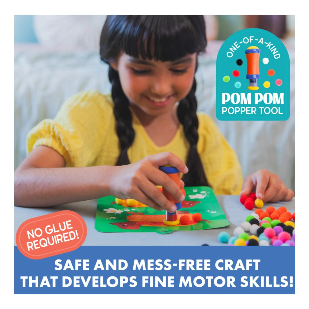 Pom Pom Popper Kit nabízí dětem zábavný způsob, jak tvořit 3D obrázky s motivy zvířátek bez potřeby lepidla. Pom-pom nástroj umožňuje snadné a čisté připevnění barevných kuliček na kartičky, což děti motivuje k samostatné hře i kreativnímu vyjadřování. Hra podporuje jemnou motoriku, učí rozpoznávat barvy a rozvíjí představivost a trpělivost.