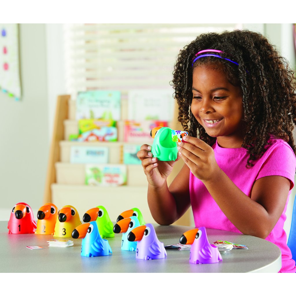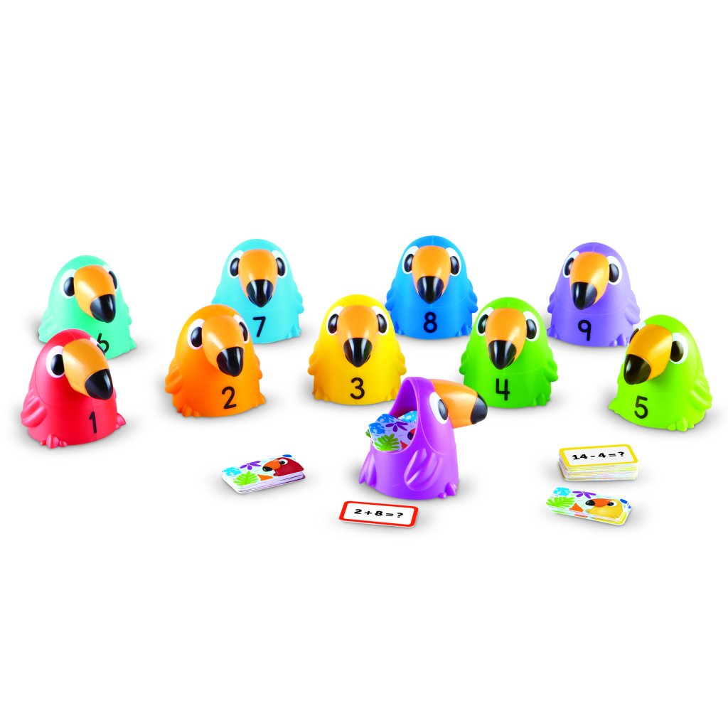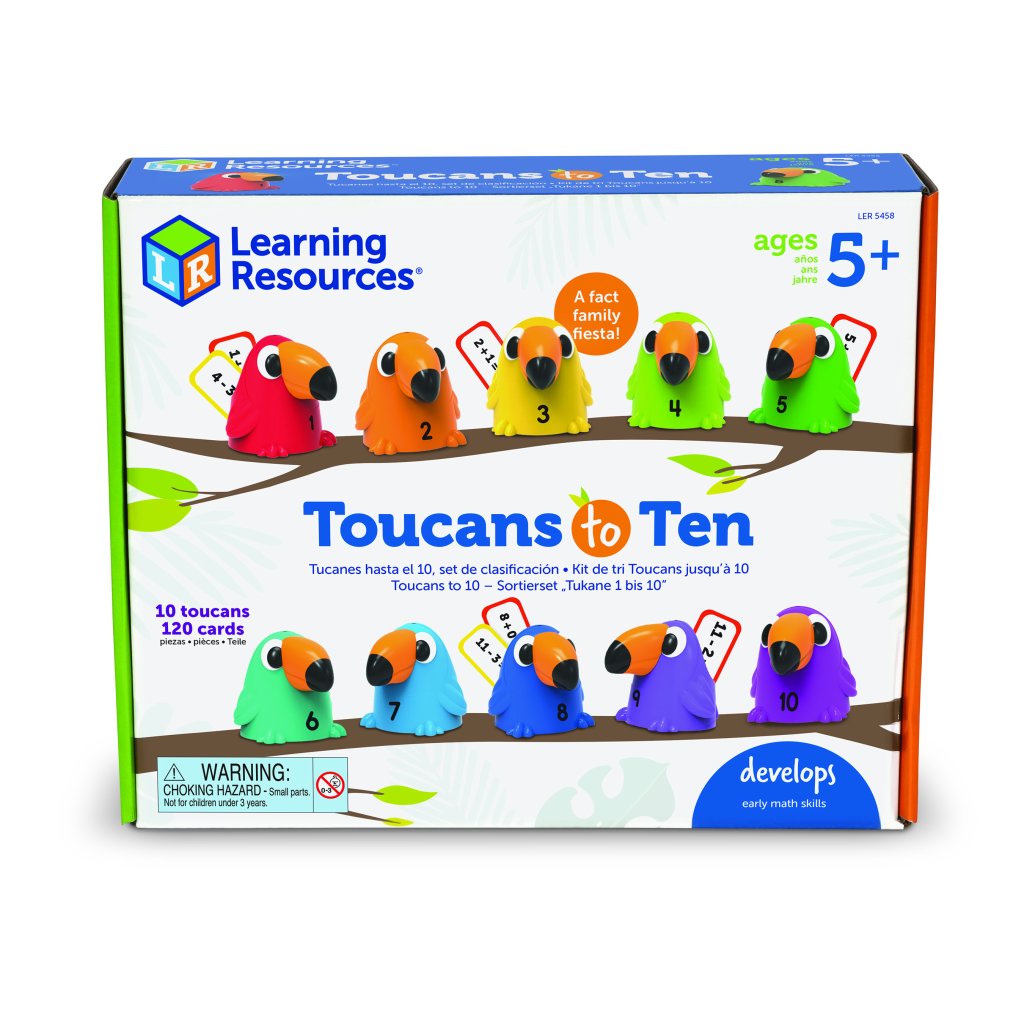 Toucans to 10 je interaktivní hra, která učí děti sčítání a odčítání zábavným a názorným způsobem. Dítě po vyřešení příkladu vloží kartu do tukaního stojánku se správným číslem. Díky tomu si přirozeně osvojuje tzv. „fact families“ – skupiny matematických faktů se společnými čísly. Barevné provedení, trvanlivý materiál a možnost opakování dělají ze sady atraktivní pomůcku pro školy, skupinovou práci i domácí procvičování.