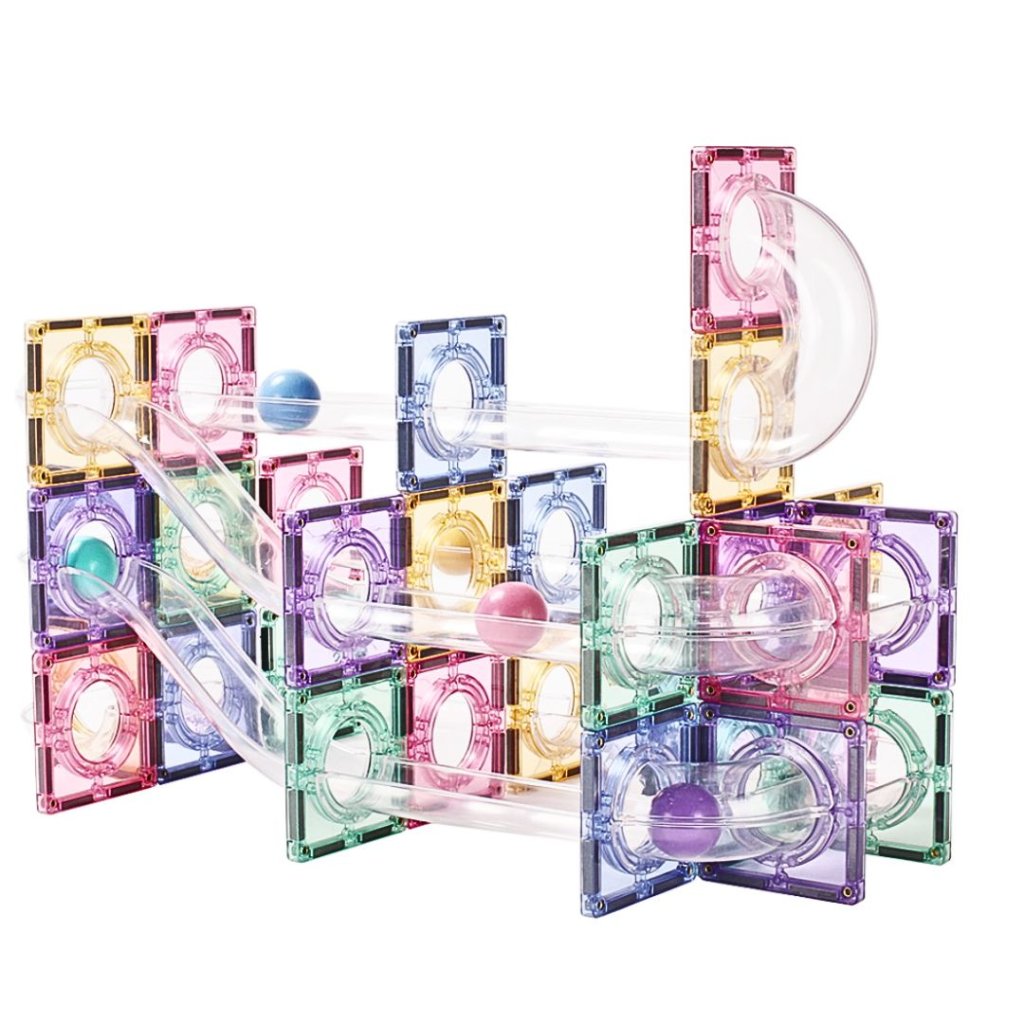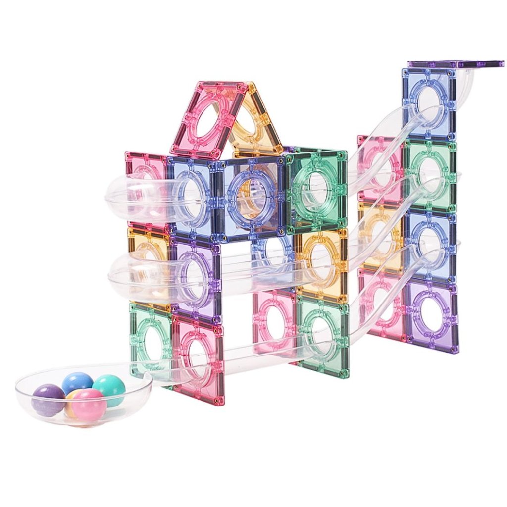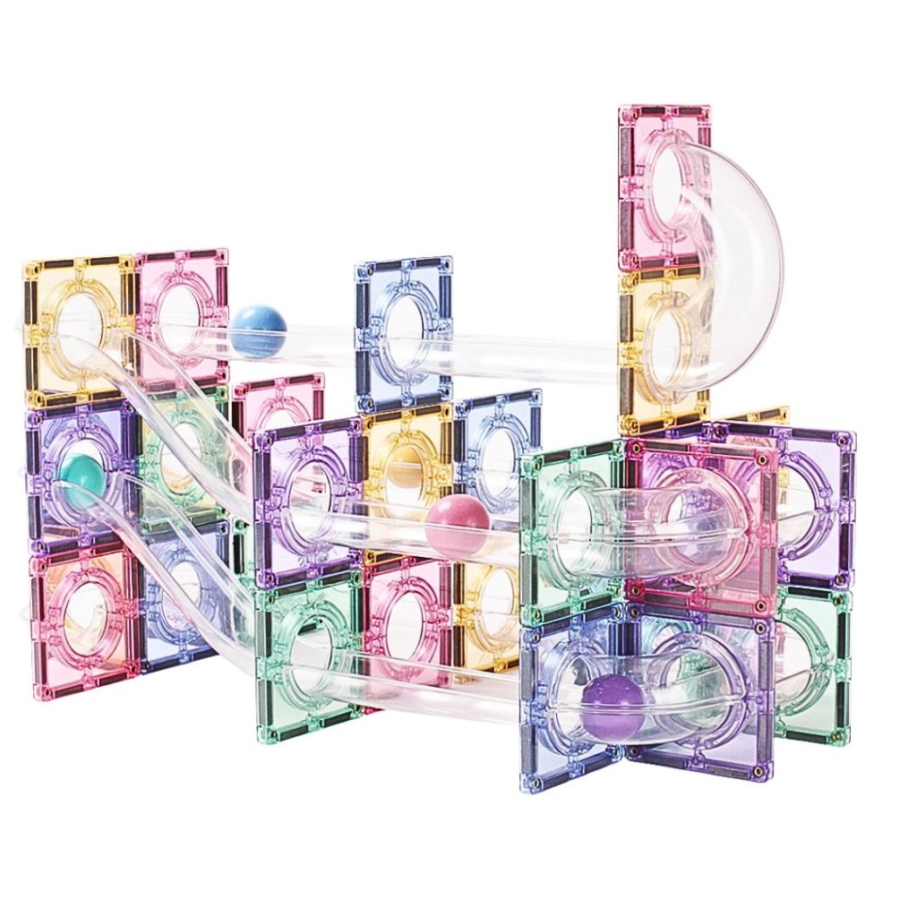 Magnetická stavebnice s pastelovými dlaždicemi a průhlednými trubkami umožňuje dětem stavět originální 3D kuličkové dráhy.