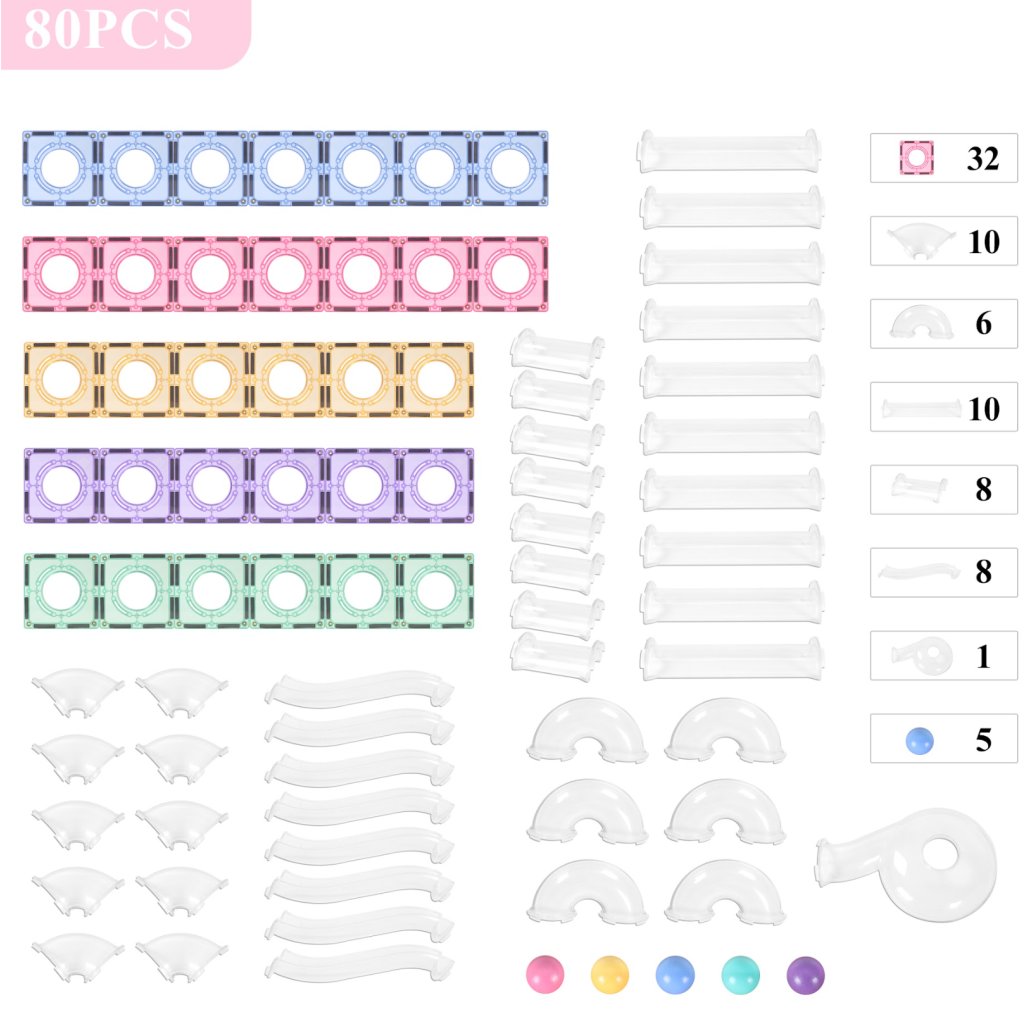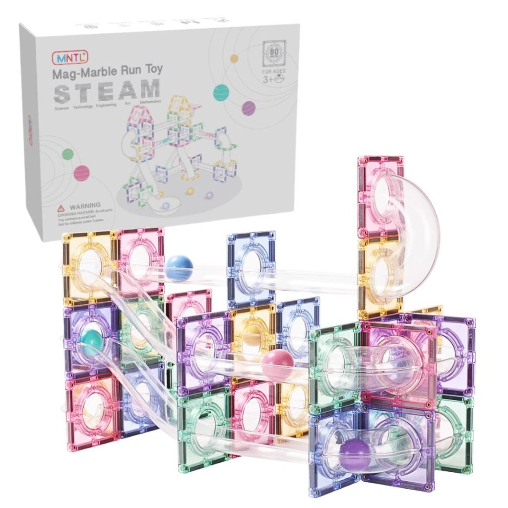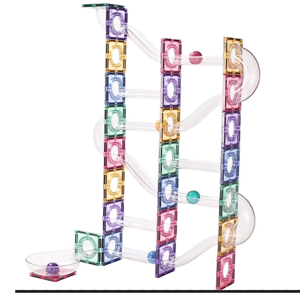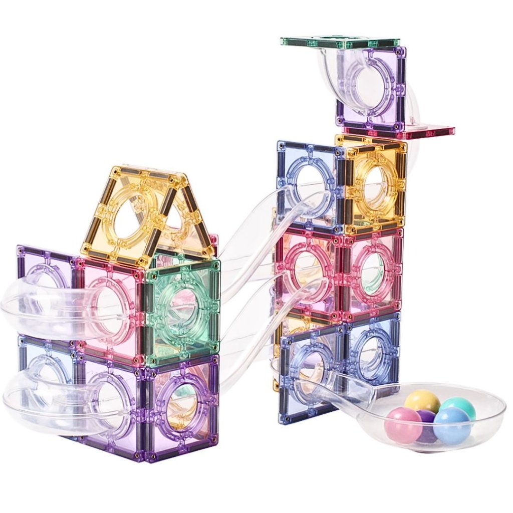 Magnetická stavebnice s pastelovými dlaždicemi a průhlednými trubkami umožňuje dětem stavět originální 3D kuličkové dráhy.