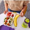 Krabička se vyznačuje flexibilním silikonovým těsněním, které umožňuje uložit celé jablko nebo jiné ovoce, a také prostor pro jogurt (nikoliv tekutiny). Vnitřní přepážky jsou vyjímatelné, což vám umožní přizpůsobit vnitřní uspořádání boxu podle aktuálních potřeb. Jednoduché otevírání pak umožňuje dětem samostatně se obsloužit, a silikonová rukojeť usnadní přenášení.