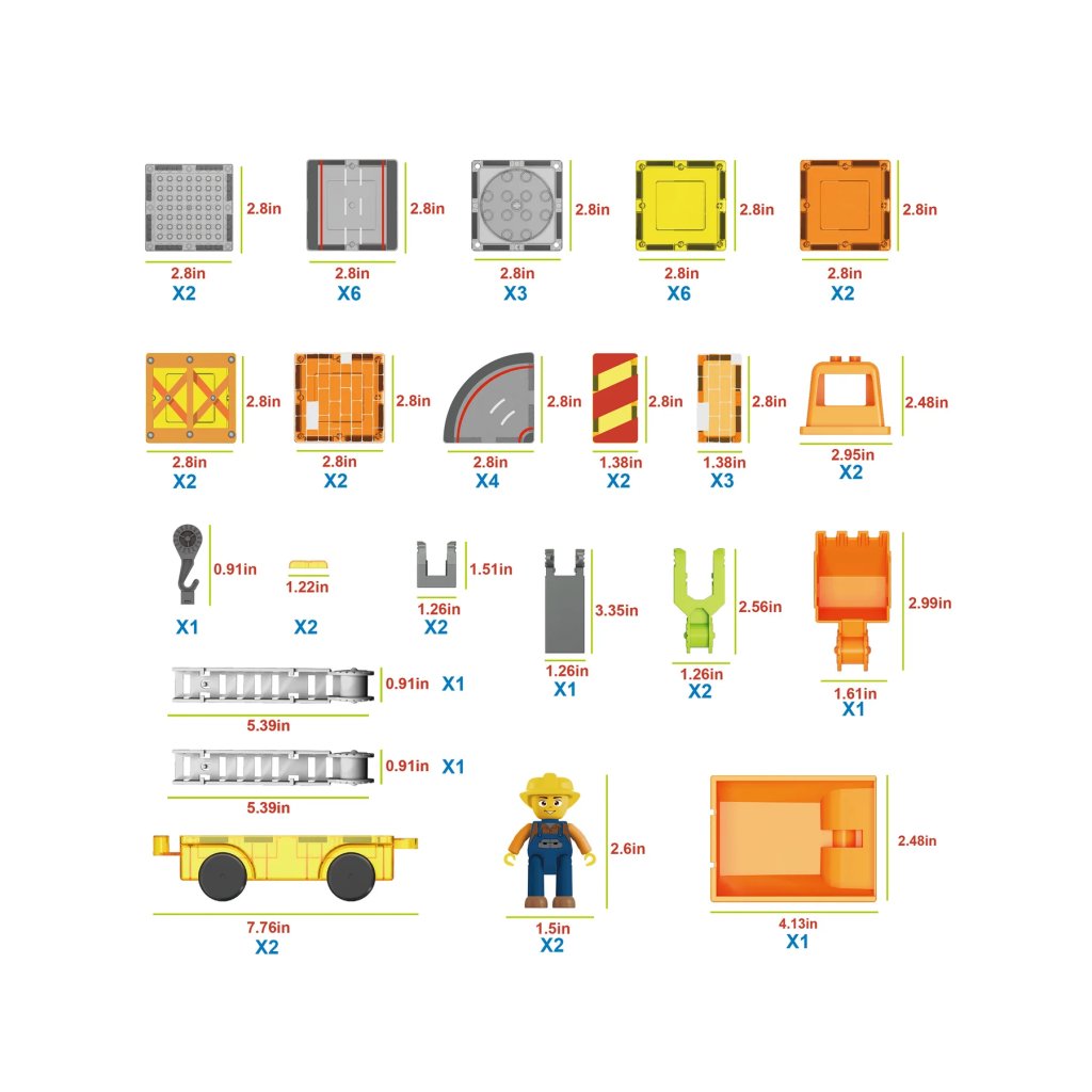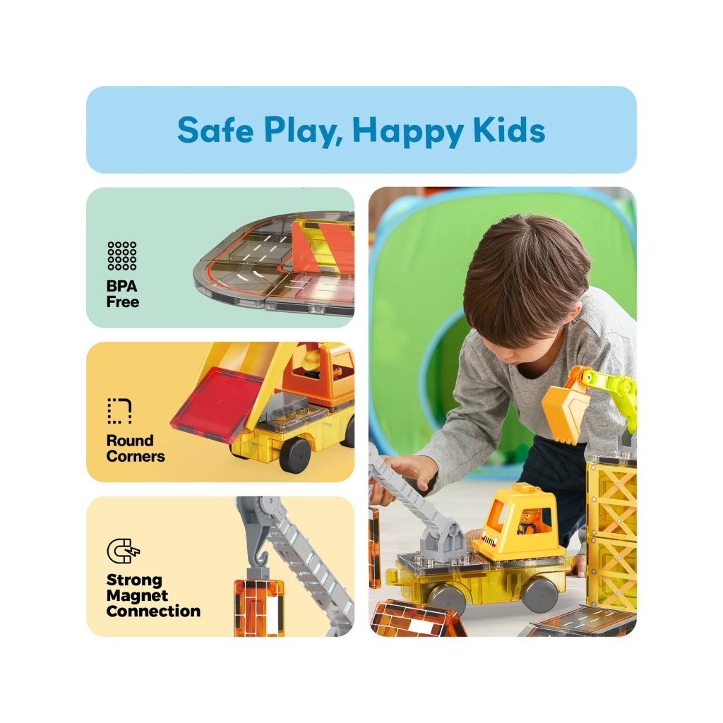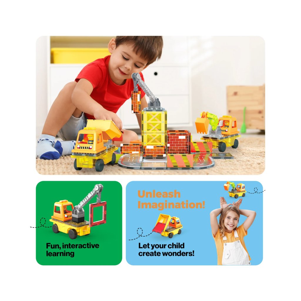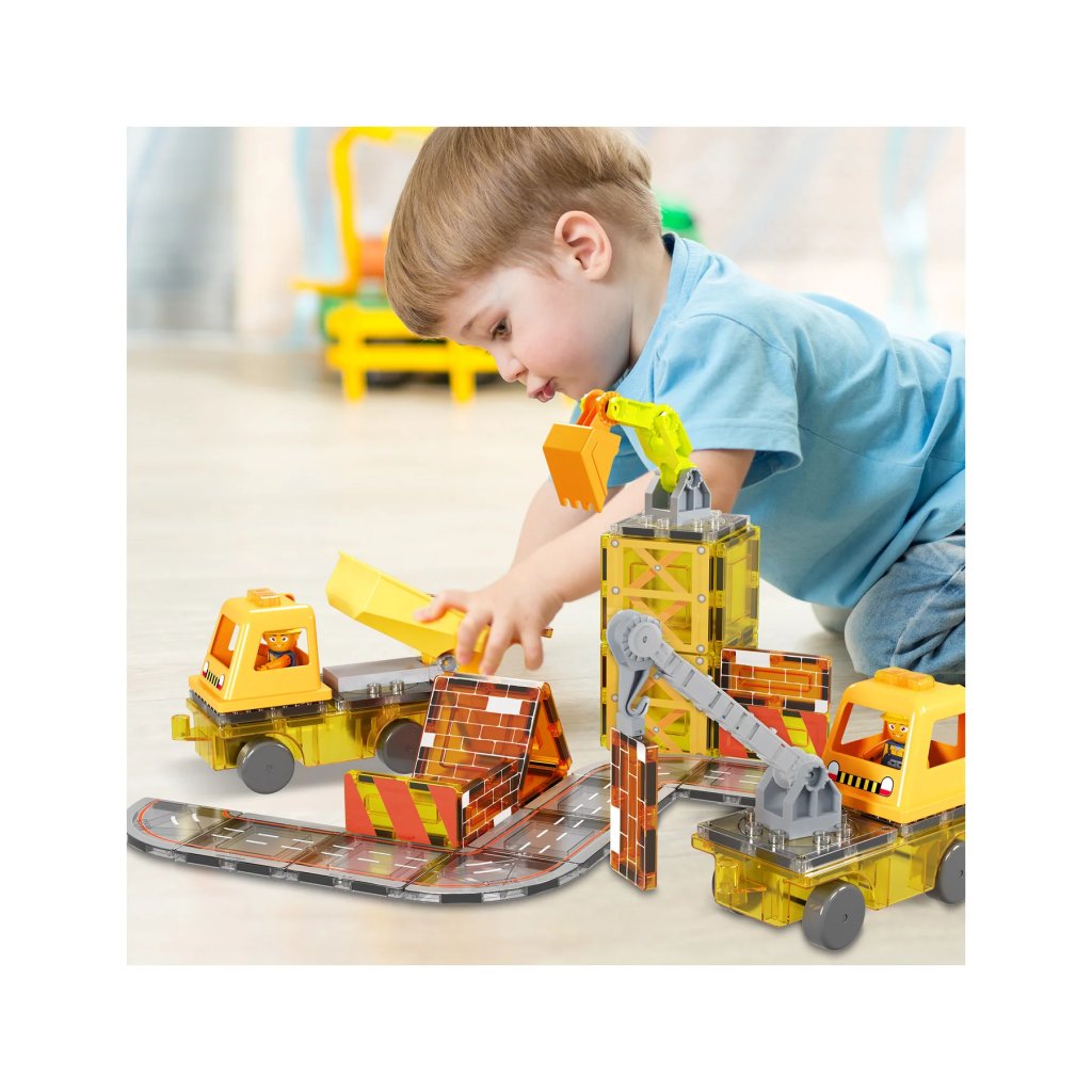 S tímto 5v1 setem mohou děti z magnetických dílků a doplňků sestavit jeřáb, sklápěčku, žebříkový vůz, bagr nebo rýpadlo. Součástí jsou i postavičky a podvozky, takže hraní může začít okamžitě.