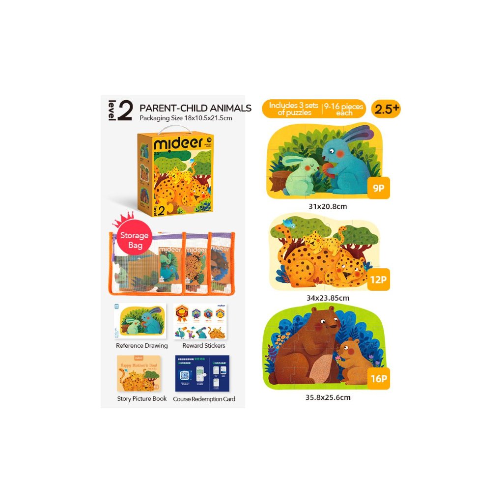 Puzzle s pytlíčky na uložení a certifikátem - Mideer - LEVEL 02 - Mláďátka s maminkou