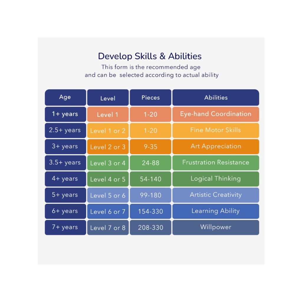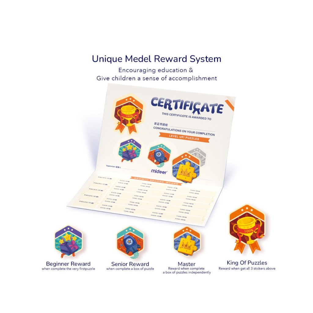 LEVEL UP! Světově oceněné puzzle, které bylo navrženo na vědecké úrovni. Puzzle je rozděleno podle jednodlivých levelů a podle toho můžete vybírat svou krabičku puzzle. V každém balení jsou také pytlíčky na uchování puzzle, přehled úrovní podle kterých puzzle můžete dále pořizovat a také samolepky, které si děti lepí do certifikátu za úspěšné složení.