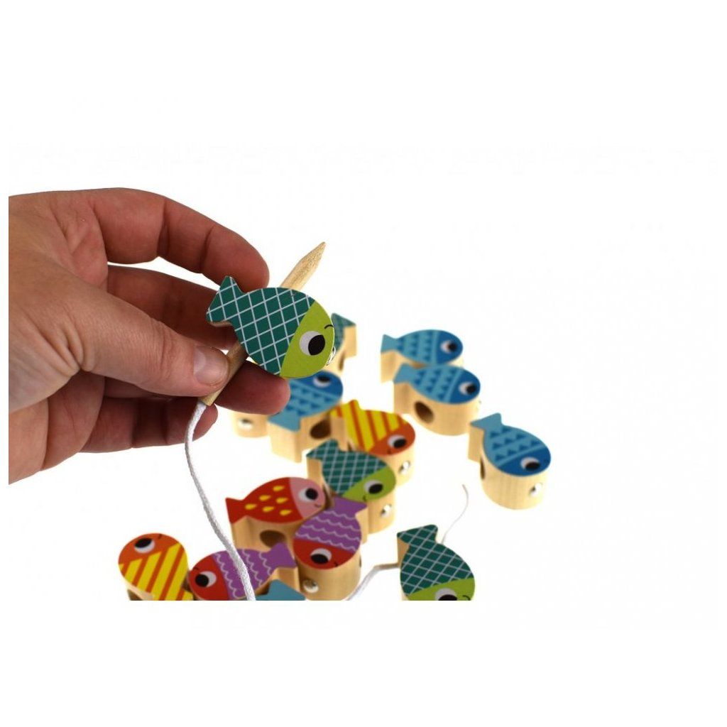 - Navlékání - Vezměte provázek s dřevěnou jehlou a můžete navlékat rybičky.