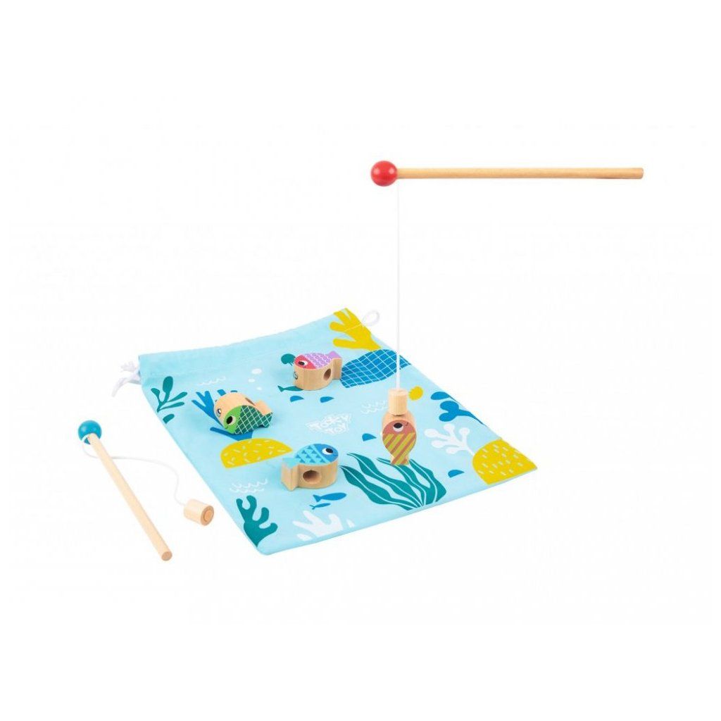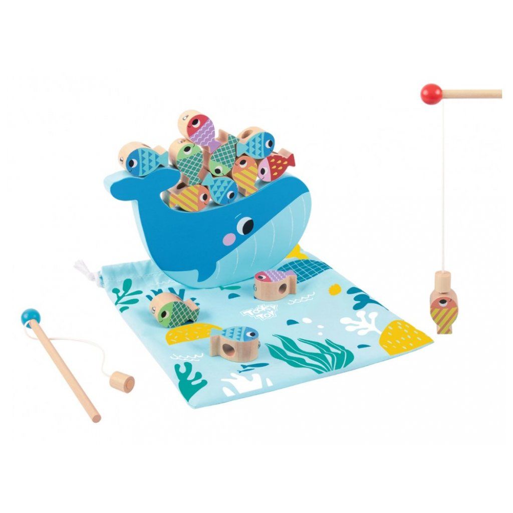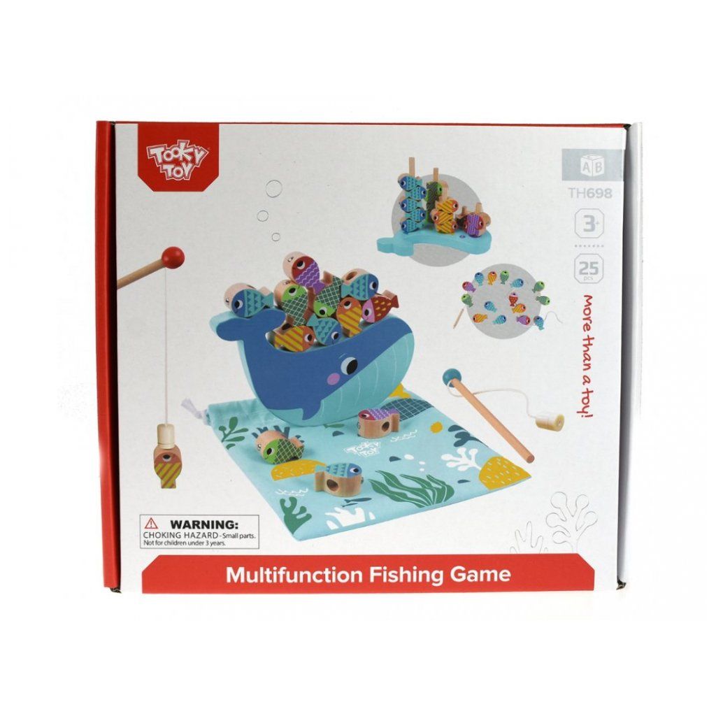 Se hrou Chytání rybiček si užijí děti spoustu zábavy. Kromě tradičních magnetických rybiček, které děti chytají na udici, hra obsahuje také balanční hru, nasazování, počítání čísel a navlékání.