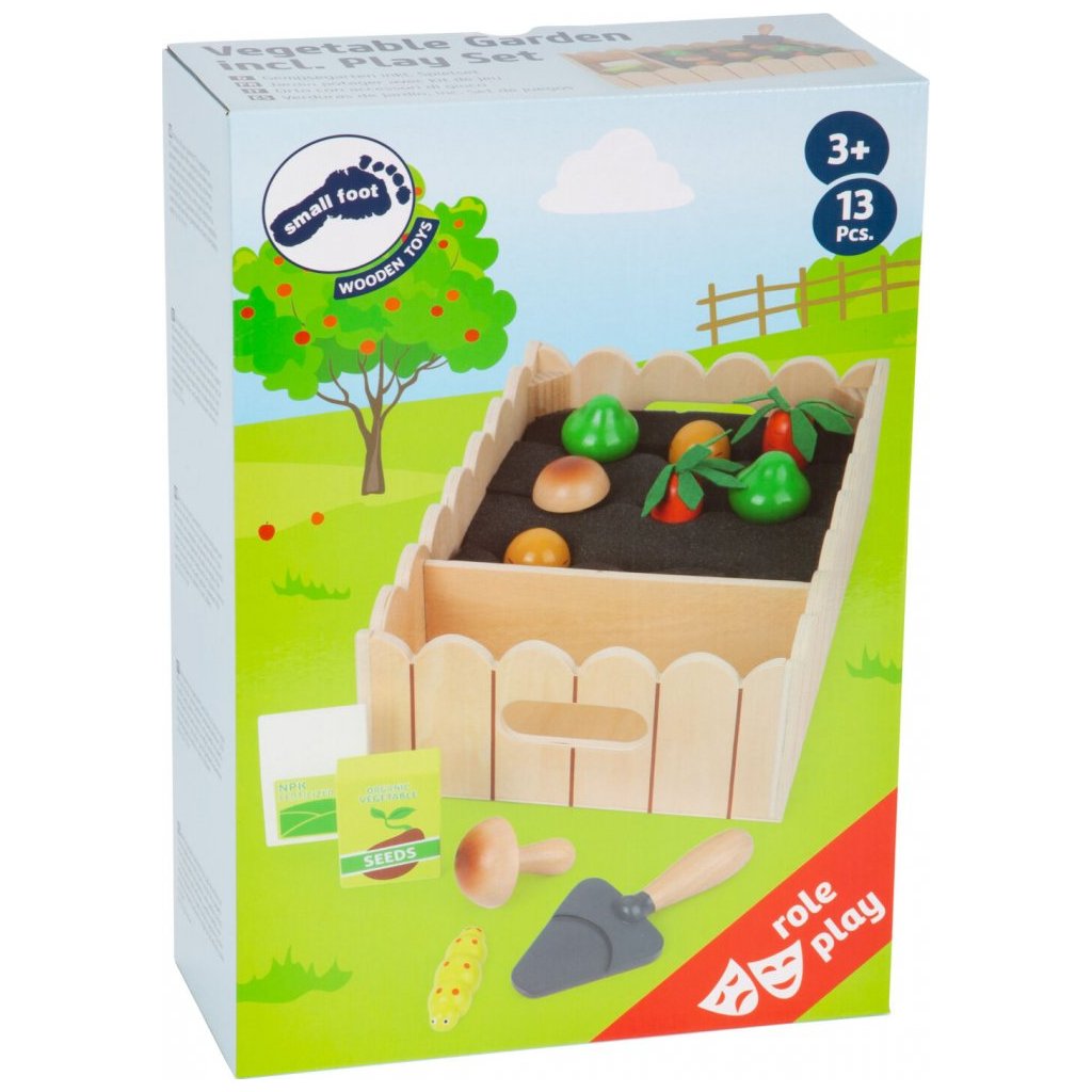 Všichni mladí zahrádkáří, pozor! Tento zeleninový záhonek s dřevěným oplocením je vším, po čem srdce mladých zahradníků touží. Kromě mkrve, hub, brambor a brokolice má tento set také lopatku, hnojivo a semínka. V záhonku se také zabydlela housenka! Mladí zahradníci se naučí jak zasadit zeleninu a jak se o ni před sklizní starat. Tato hračka rozvíjí jemnou motoriku a představivost. Obsahuje 13 ks příslušenství