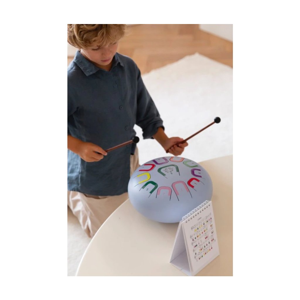 TAMBÚ je kovový melodický bubínek s jemným, uklidňujícím zvukem. Díky barevnému a číselnému značení not je ideální pro začátečníky i pokročilé. Rozvíjí kreativitu, soustředění i jemnou motoriku dětí.